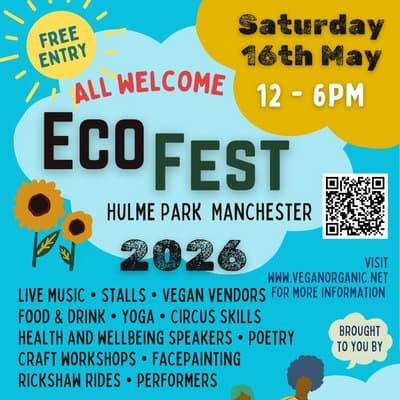 Back to What's OnShareWhat's Onvia SkiddleManchester Eco Fest11 April 2026Eco Fest 2026 - Powered by the Sun & Good Vibes! Hulme Park Saturday 16th May 12 midday - 6pm Free event in the park! All Vegan!Read full article at SkiddleI'm interestedComments No comments yet. Be the first to share your thoughts!